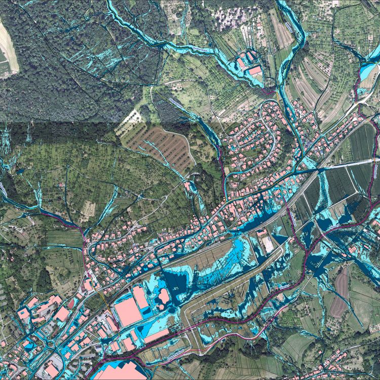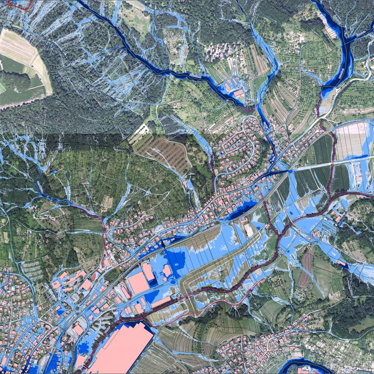Die Karten zeigen im Detail für Oberndorf die berechneten Fließgeschwindigkeiten sowie die zu erwartende Ausdehnung und maximale Tiefe der Überflutung. Mit einem Klick auf das Bild wird dieses vergrößert. Ein Download der hochauflösenden PDF-Karte ist über den Button unter dem Vorschaufoto möglich.